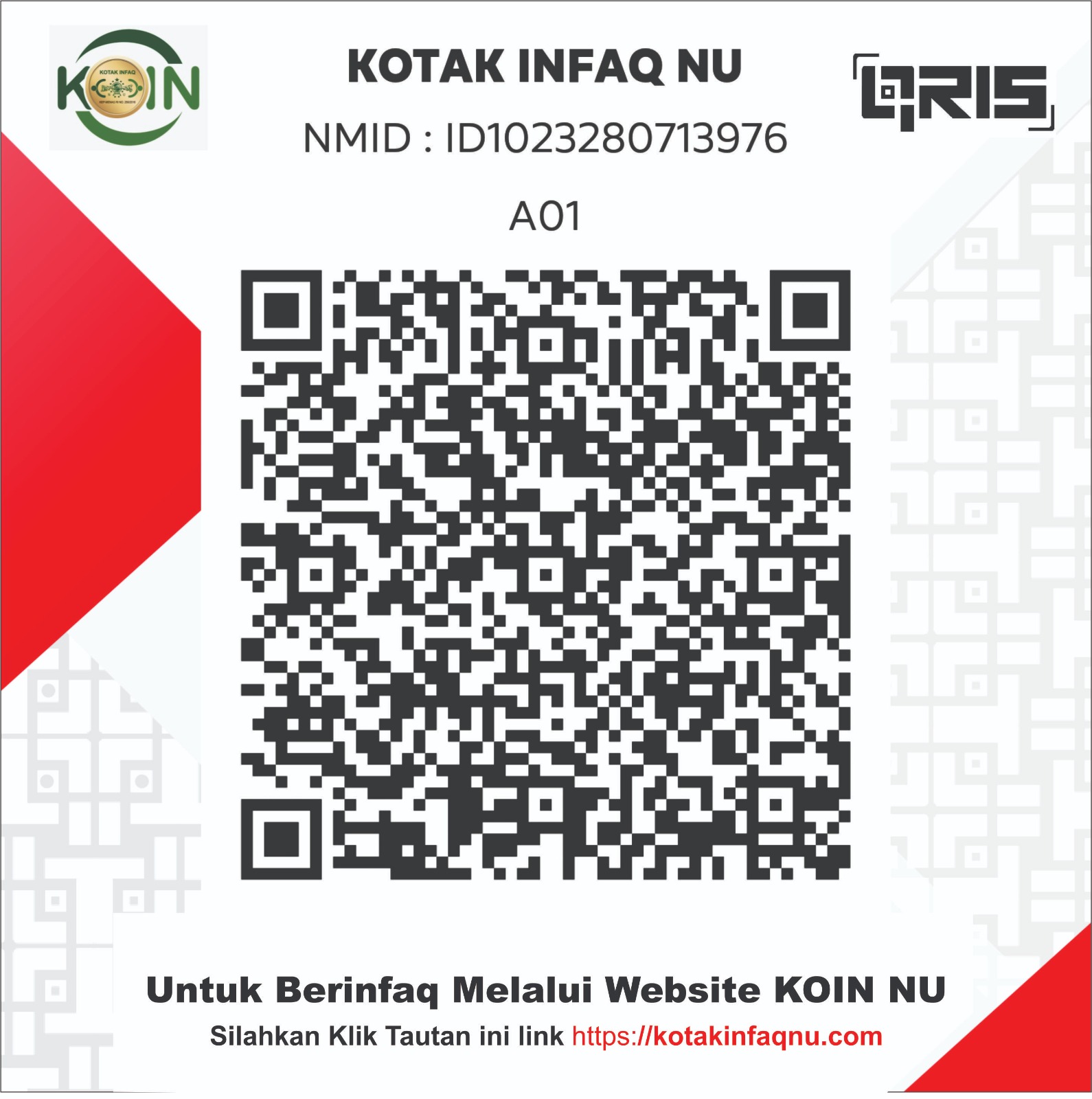 Koin (Kotak Infaq) NU merupakan gerakan kolektif yang dilakukan secara massif oleh seluruh Nahdliyin dengan memanfaatkan jaringan struktural yang ada. Jaringan struktur NU mulai dari Pusat sampai Ranting (desa).